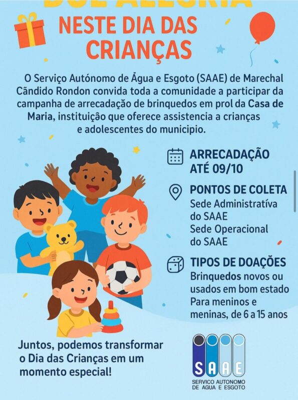 As doações seguem até o dia 09 de outubro, nos pontos de coleta já definidos pelo SAAE. São aceitos brinquedos novos ou usados em bom estado, destinados a meninos e meninas entre 6 e 15 anos.